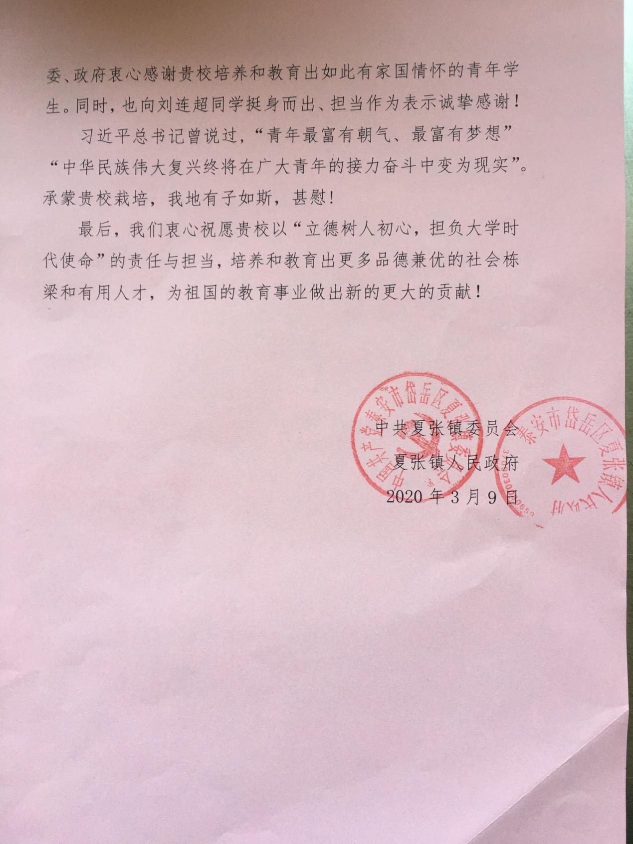 近日,山东商院收到了一封来自泰安市岱岳区夏张镇的感谢信,信中对学院刘连超同学在当地疫情防控工作中的付出与贡献表示感谢。