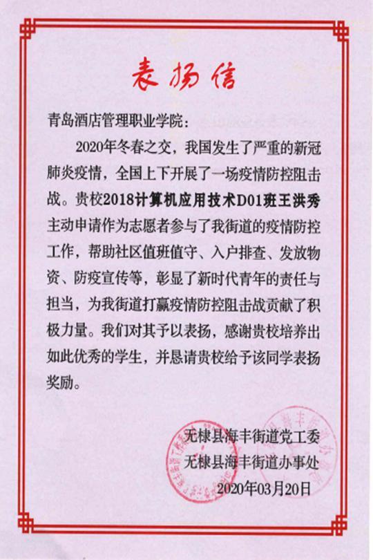 日前,青岛酒店学院收到了来自滨州市无棣县海丰街道党工委和青岛市市北区宁夏路街道发来的表扬信,赞扬学院青年团员王洪秀、李柞锌作为志愿者在当地疫情防控工作中作出的贡献。