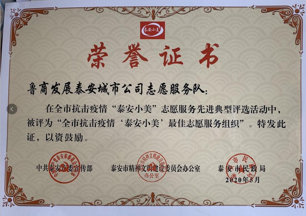 责任国企,抗疫先锋。近日,鲁商发展泰安城市公司志愿服务队荣获由泰安市委宣传部、市民政局颁发的“泰安小美”最佳志愿服务组织奖。