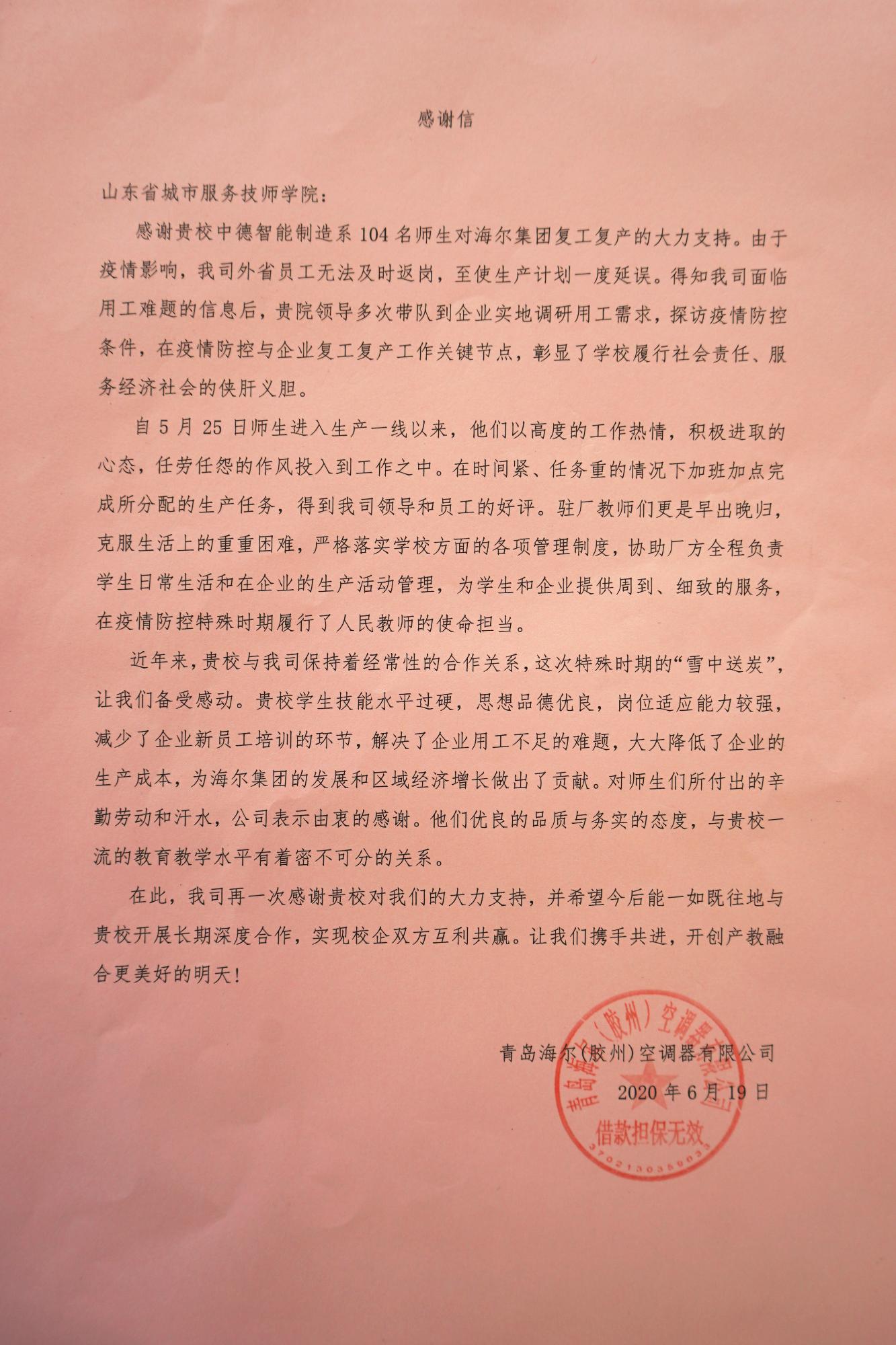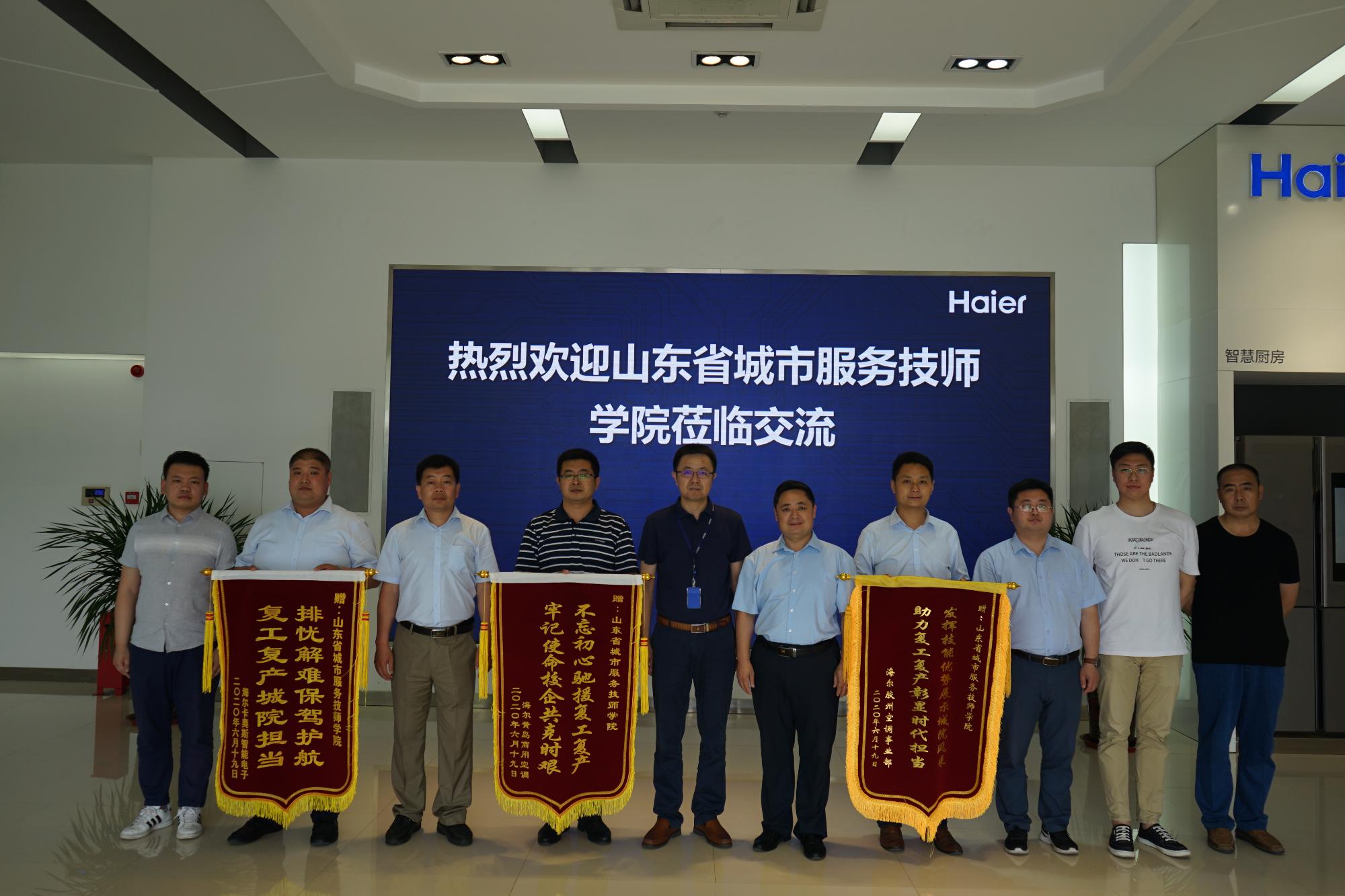 6月19日,学院党委副书记刁洪斌带队赴青岛海尔集团,看望慰问支援复工复产的一线师生。海尔集团西北大区人力资源部部长汪涛、海尔集团胶州空调厂区总经理许磊以及海尔集团卡奥斯智能电子有限公司总经理高广伟,代表企业对学院师生所展现的优良思想品质与务实工作作风给予高度赞扬。企业认为,学院构建的红色思政教育、工匠精神与感恩教育“三位一体”立德树人新模式,从精神和灵魂深处为培养“下得去、上手快、留得住、用得上”的技能人才奠定了思想文化基础,最大程度降低了学生流失率。尤其是在疫情防控的特殊时期,学院积极驰援,助力复工复产,更是彰显了省城市学院师生履行社会责任、服务经济社会的拳拳之心。他们希望深入推进双方合作的广度和深度,在招工招生一体化、人才培养模式创新、企业教师工作站建设等方面,打造校企合作的“齐鲁样板”,希望在学院投资建设生产型实训中心和面向社会的职业技能培训基地,并向学院赠送了锦旗和感谢信。