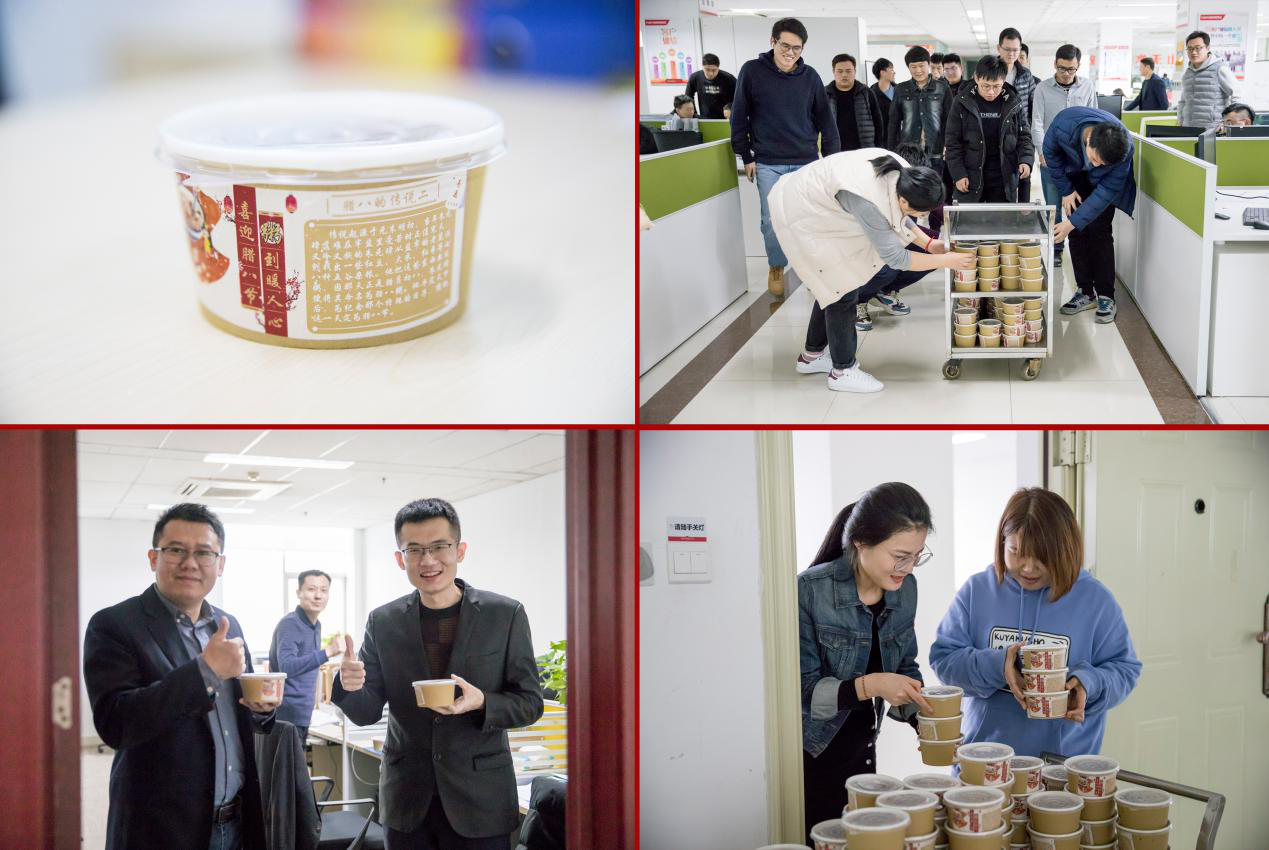 活动中,工作人员推着满满一车新鲜出炉、热气腾腾的腊八粥逐层为每一位员工送去节日祝福。一碗碗突然出现的腊八粥让大家喜出望外,一份份贴心的祝福让大家倍感温暖。值得注意的是,此次腊八粥的包装特别采用了可降解的纸质碗包装,旨在透过寓意吉祥的腊八粥传播环保理念,让垃圾减量和绿色环保意识更加深入人心。此外,易通工会还在包装盒的外侧粘贴了印有“传说小故事”的贴纸,让大家了解腊八节的历史渊源,在享受美食的同时收获知识。