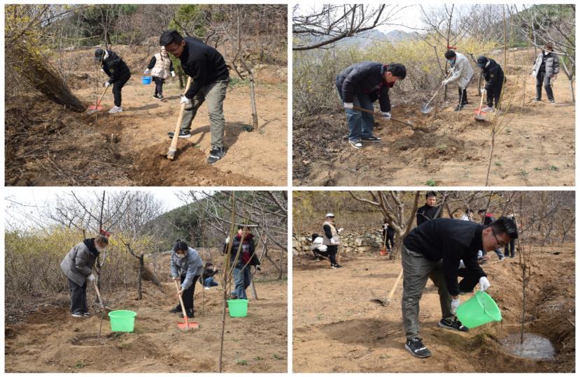 植树现场,大家挥锹铲土、扶苗正苗、填土踩实、提水浇灌,各组团员青年干劲十足、协作融洽,经过一个多小时的努力,一颗颗树苗在田地里“安家落户”,也将春天里象征希望的种子深深埋下。