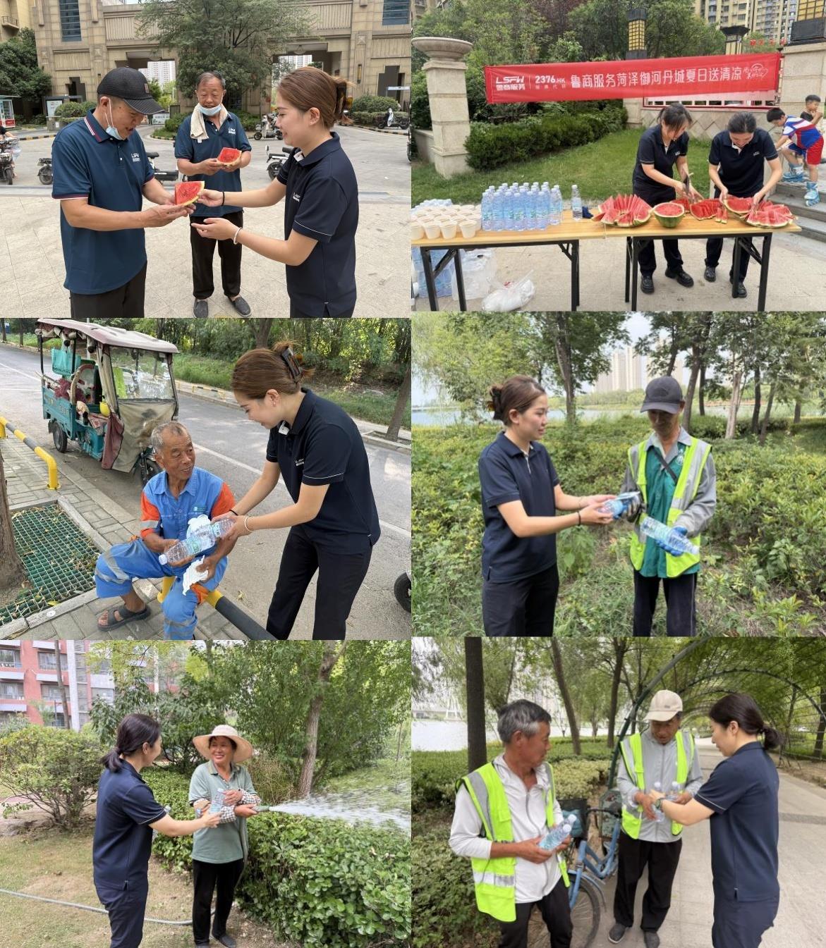 鲁商服务各项目还特别关注环卫工人群体,菏泽凤凰城和御河丹城项目在小区门口组织专人将解暑西瓜、矿泉水送到一线,为环卫工人递上冰镇瓶装水,还细心将新鲜西瓜切块分装,让大家在高温中能歇脚解渴。环卫工李师傅感动地说:“这么热的天能吃上西瓜,心里是真凉爽!”