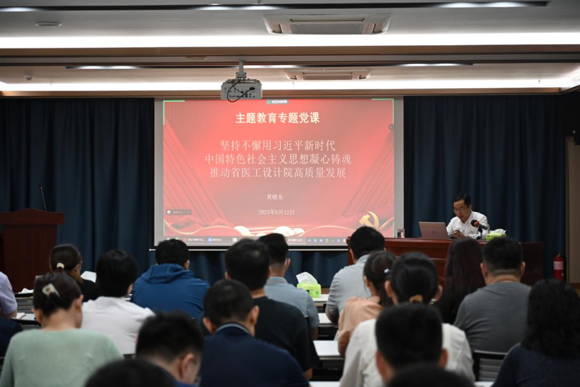 黄晓东以《坚持不懈用习近平新时代中国特色社会主义思想凝心铸魂 推动省医工设计院高质量发展》为题,从“深入领会学习贯彻习近平新时代中国特色社会主义思想主题教育的总要求和根本任务”“习近平新时代中国特色社会主义思想的内容体系”“坚持不懈用习近平新时代中国特色社会主义思想凝心铸魂,推动省医工设计院高质量发展”等3方面进行阐述。他指出,要把学习成果转化为推动省医工设计院高质量发展的生动实践,全力打造核心竞争力、深化全过程咨询服务、加大混改和创新工作力度、锻造优良工作。