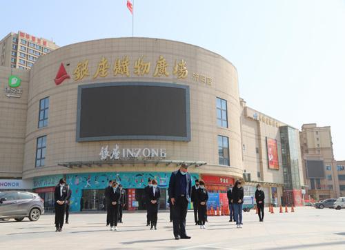 当天10时起,银座潍坊区域全体党员及干部职工在广场集合,防空警报鸣响,全体人员神情凝重肃立、低头默哀3分钟。