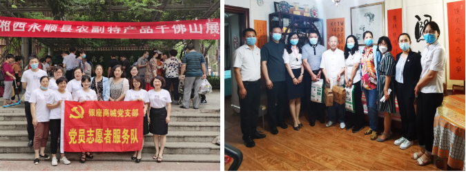 在社区举办的湘西扶贫农副产品展销现场,银座集团总部和商城店党员志愿队按照疫情防控要求,认真维持秩序,为社区群众提供优质的服务,并将购买的农副产品作为慰问品送到社区困难党员家中。