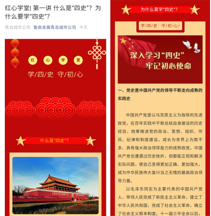 历史是最好的教科书,党史、新中国史、改革开放史、社会主义发展史是“四史”学习教育的四大板块,更是全体党员干部的必修课。为切实把“四史”作为思想武装的重中之重,加强教育与自省,2021年2月18日,鲁商发展青岛城市公司党总支晴虹党建之“红心学堂”正式上线!