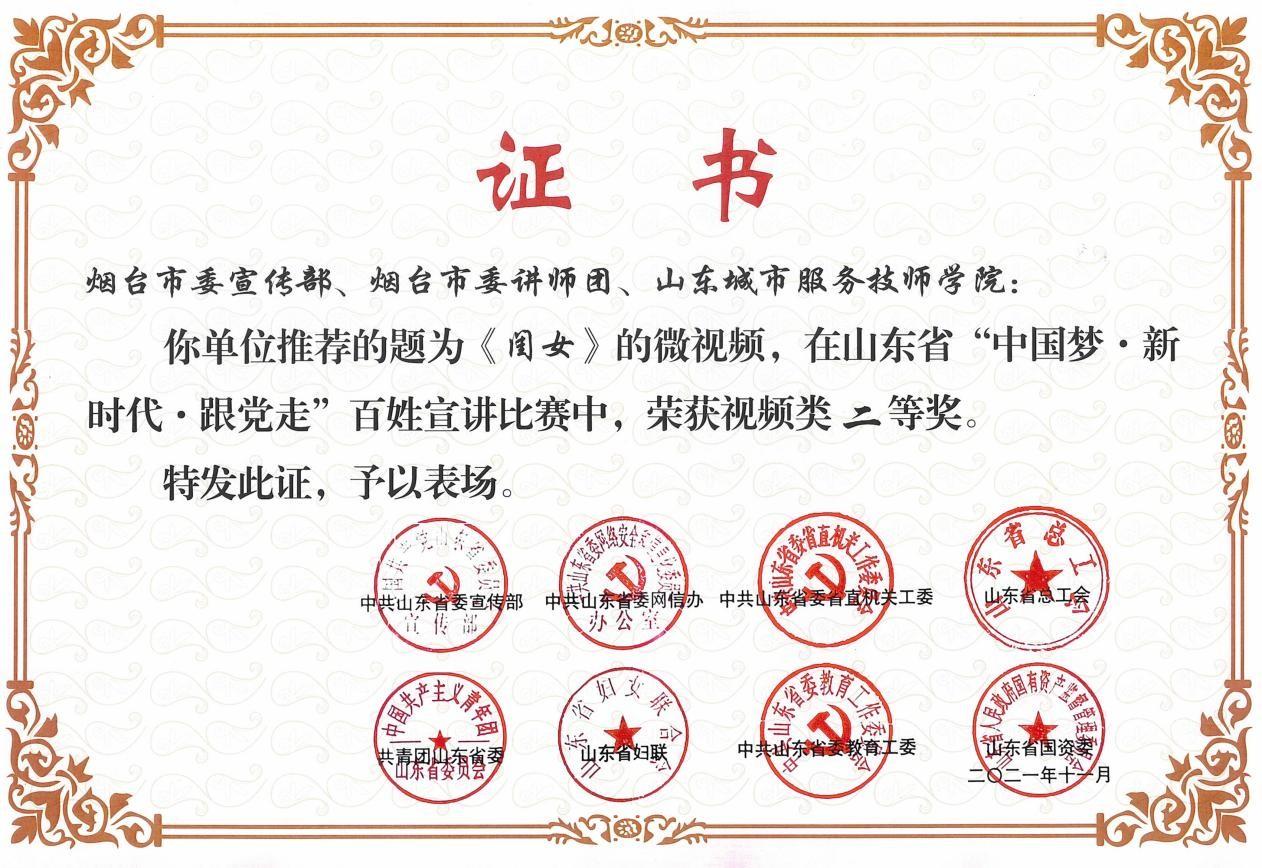 11月3日至4日,由省委宣传部、省委网信办、省委省直机关工委、省总工会、团省委、省妇联、省教育厅(省委教育工委)、省国资委联合主办的全省“中国梦·新时代·跟党走”百姓宣讲比赛在济南成功举办,省城市学院与烟台市委宣传部、烟台市委讲师团联合选送的微视频作品《闺女》荣获二等奖。