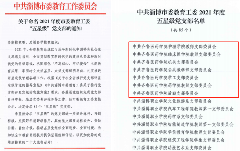 近日,淄博市委教育工委发布《关于命名2021年度市教育工委“五星级”党支部的通知》,齐鲁医药学院护理学院教师党支部、临床医学院教师党支部、机关党支部、公共教学部党支部、学工党支部、药学院教师党支部、后勤党支部7个党支部获评“五星级”党支部。
