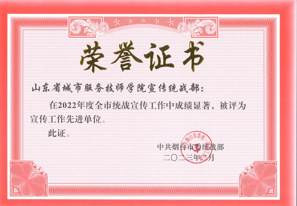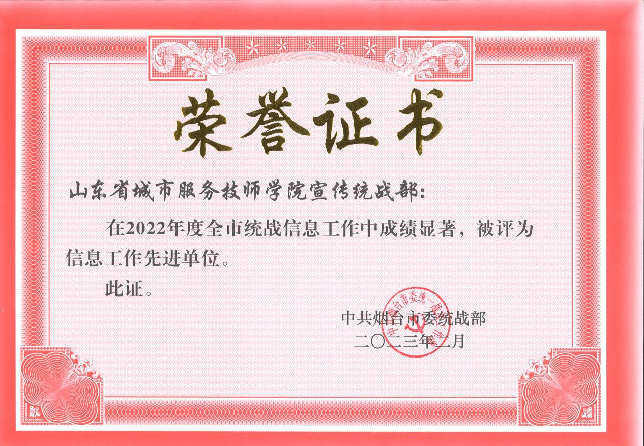 近日,中共烟台市委统战部下发《中共烟台市委统一战线工作部关于表扬2022年度统战理论研究、信息、宣传工作先进单位和先进个人及实践创新成果的通报》,省城市学院宣传统战部荣获2022年度全市统战信息工作先进单位和统战宣传工作先进单位,2人获评全市统战信息工作先进个人、统战宣传工作先进个人。