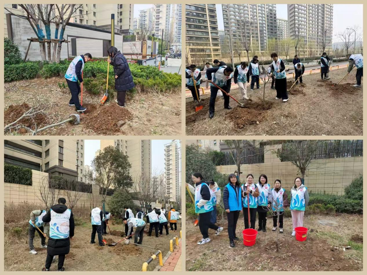 在植树现场,大家挥锹铲土、扶树培土、提水浇灌,认真完成每一道工序,合力将一棵棵树苗种下。经过一番忙碌,10棵海棠树苗迎着春风挺立,为这片空地增添了勃勃生机。