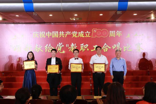 经过激烈角逐,酒店管理学院代表队等4支合唱队伍荣获一等奖;基础部、马克思主义学院代表队等3支合唱队伍荣获二等奖;烹饪学院代表队等5支合唱队伍荣获三等奖。学院党委书记李达、院长姜玉鹏、副院长张宗国分别为获奖合唱队颁发奖牌并合影留念。合唱比赛在全场齐声高唱《没有共产党就没有新中国》歌声中圆满落下帷幕。