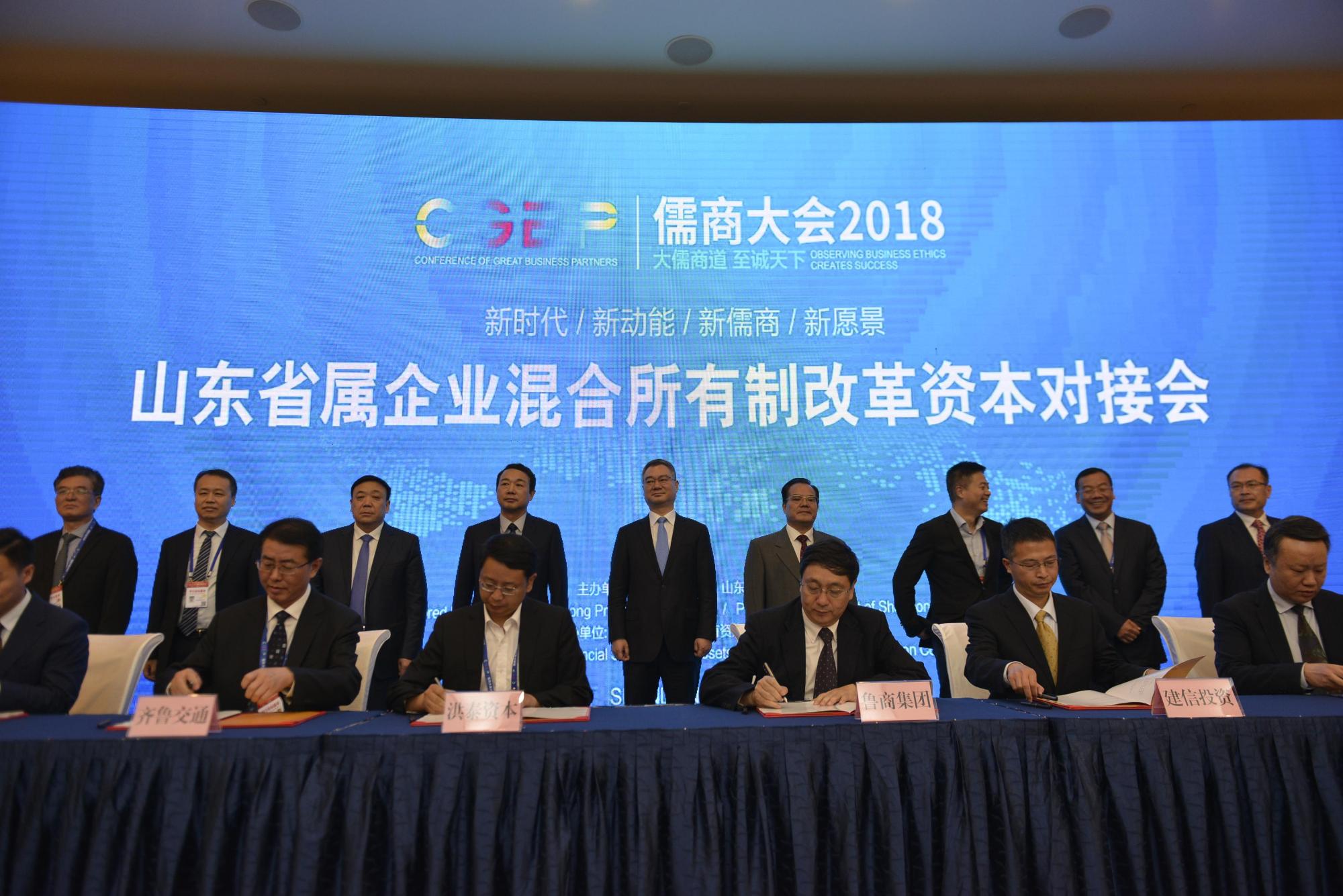 9月29日,省委常委、省委秘书长王清宪出席省国资委举办的“儒商大会2018-山东省属企业混合所有制改革资本对接会议”,并见证鲁商集团与洪泰资本签约。会上,鲁商集团党委书记、董事长高洪雷推介了集团混改项目,党委副书记、总经理凌沛学与洪泰基金合伙人、洪泰山东总部董事长李文峰进行签约。