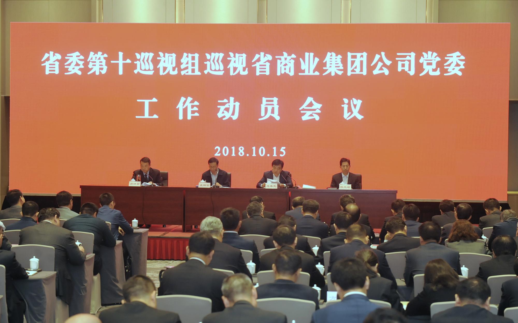 按照省委关于巡视工作的统一部署,2018年10月15日上午,省委第十巡视组巡视山东省商业集团有限公司党委工作动员会召开。会前,省委巡视工作领导小组成员孟祥吉主持召开与公司党委书记、董事长高洪雷的见面沟通会,会议传达了省委书记刘家义关于巡视工作的讲话精神。动员会上,省委第十巡视组组长龙春光就即将开展的巡视工作作了动员讲话,孟祥吉就配合做好巡视工作提出要求。高洪雷主持会议并作表态发言。