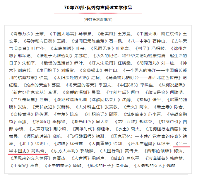 10月30日,由中广联合会有声阅读委员会主办的“中国有声”——“70年70部·优秀有声阅读文学作品”发布会在北京广播大厦隆重举行。中国作家协会会员,中国自然资源作家协会副主席,省商业集团有限公司党委书记、董事长兼省文旅集团董事长高洪雷作品《另一半中国史》入选“70年70部·优秀有声阅读文学作品”名单。该书由中央广播电视总台央广中国之声首席主播苏扬全文演播。