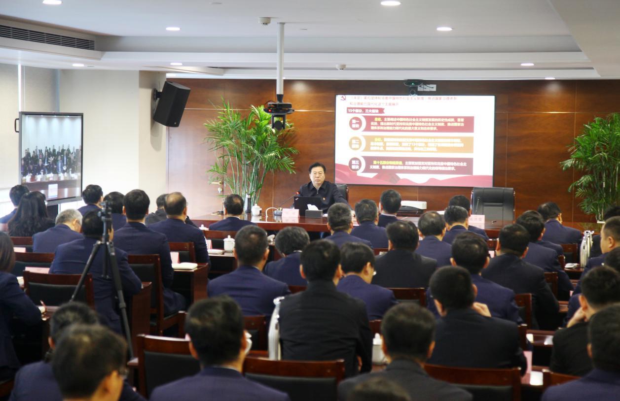在宣讲中,张斌结合自身学习和工作实际,从党的十九届四中全会的重大意义,中国特色社会主义制度和国家治理体系的13个显著优势,推进国家治理体系和治理能力现代化的总体要求、总体目标和13项重点任务,加强党的领导、确保全会确定的各项目标任务全面落实到位等四个方面,对全会精神进行了权威精辟、深入浅出、鼓舞人心的解读,引导大家进一步增强“四个意识”,坚定“四个自信”,坚决做到“两个维护”。