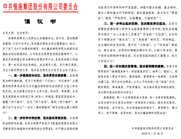 1月30日下午,银座集团党委发出倡议,在疫情防治的特殊时期,号召基层党支部发挥战斗堡垒作用,时刻保持“战备”状态;号召党组织负责人勇做“领头雁”,坚守岗位、靠前指挥;号召全体党员争做“排头兵”,增强定力韧劲、冲锋在一线;号召总部党支部支援门店,进行点对点帮扶。