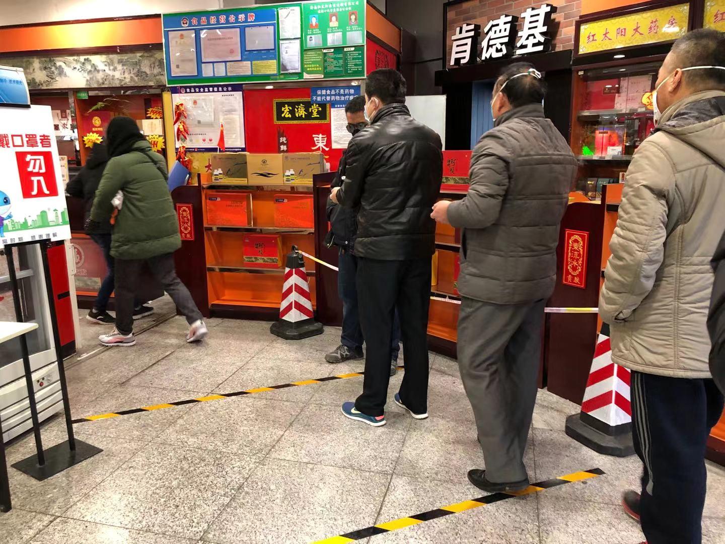 在银座花园店和玉函店,暗访组主要察看了顾客进入超市前的预先防护工作,并对员工个人尤其是收银员的防护工作提出要求。暗访组指出,在客流高峰期,人流量大、结算排队时间长,扶梯下行口和结款台之间容易造成人员聚集,存在一定的风险隐患,要安排专人予以引导。超市进口体温测量处设置了人员间隔线,但是遵守不到位,要及时对顾客进行提示。