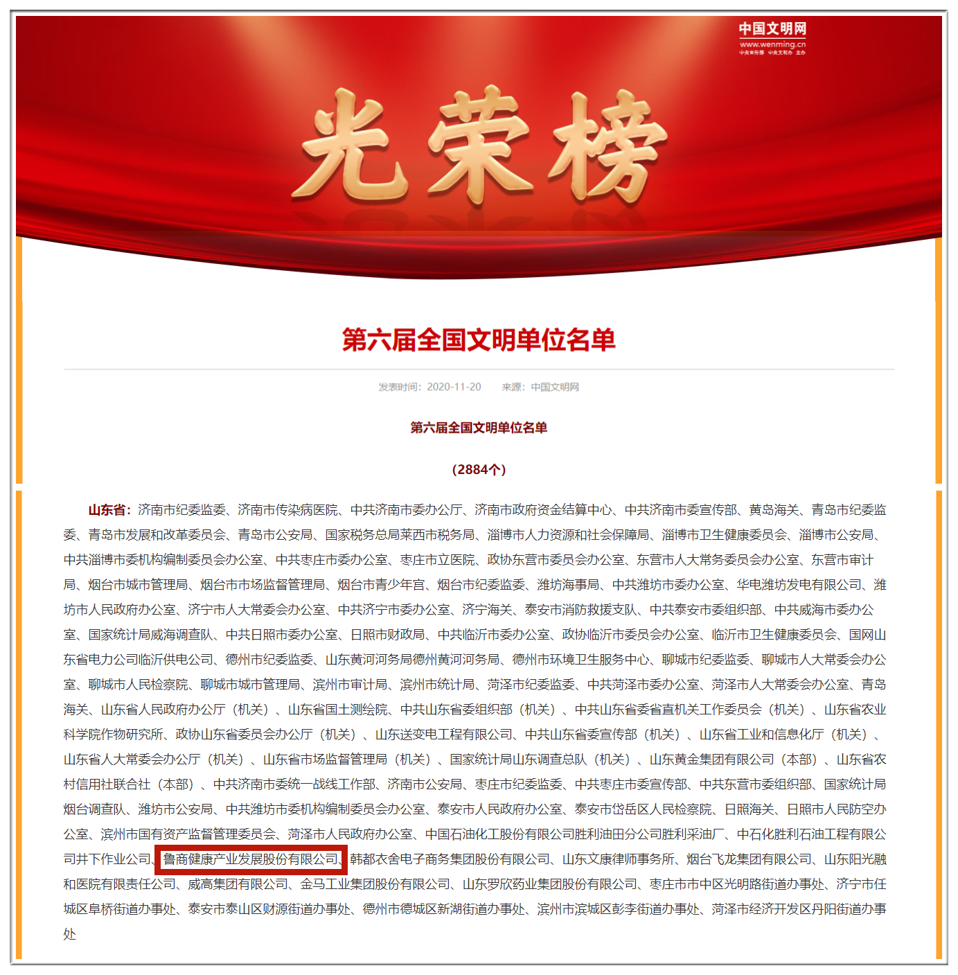 11月20日,中央精神文明建设指导委员会发布了《中央文明委关于表彰第六届全国文明城市、文明村镇、文明单位和第二届全国文明家庭、文明校园及新一届全国未成年人思想道德建设工作先进的决定》,省商业集团有限公司(简称鲁商集团)所属鲁商健康产业发展股份有限公司(简称鲁商发展)被评为第六届全国文明单位。这是集团内第一家获此殊荣的单位。