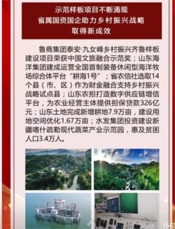 鲁商集团在助力乡村振兴战略上也取得了新成效。在山东省国资委发布山东省属国资国企2020年度亮点工作中,“鲁商集团泰安·九女峰乡村振兴齐鲁样板建设项目荣获中国文旅融合示范奖”在列。