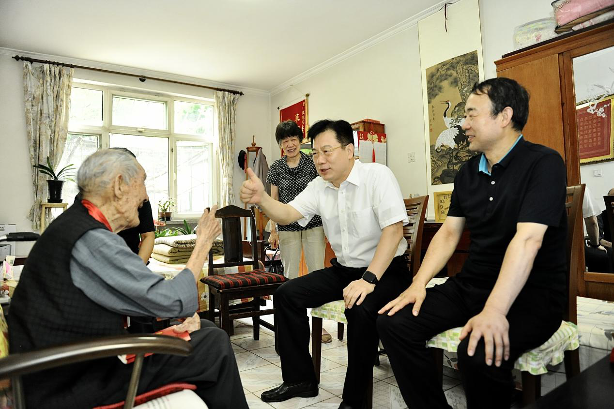 6月24日,在庆祝中国共产党成立100周年之际,省国资委党委书记、主任张斌,鲁商集团党委书记、董事长兼国欣文旅董事长高洪雷,来到济南市历下区青后小区,走访慰问鲁商集团老党员单盛甫老人。党委常委、董事、组织人力资源部部长李林陪同。