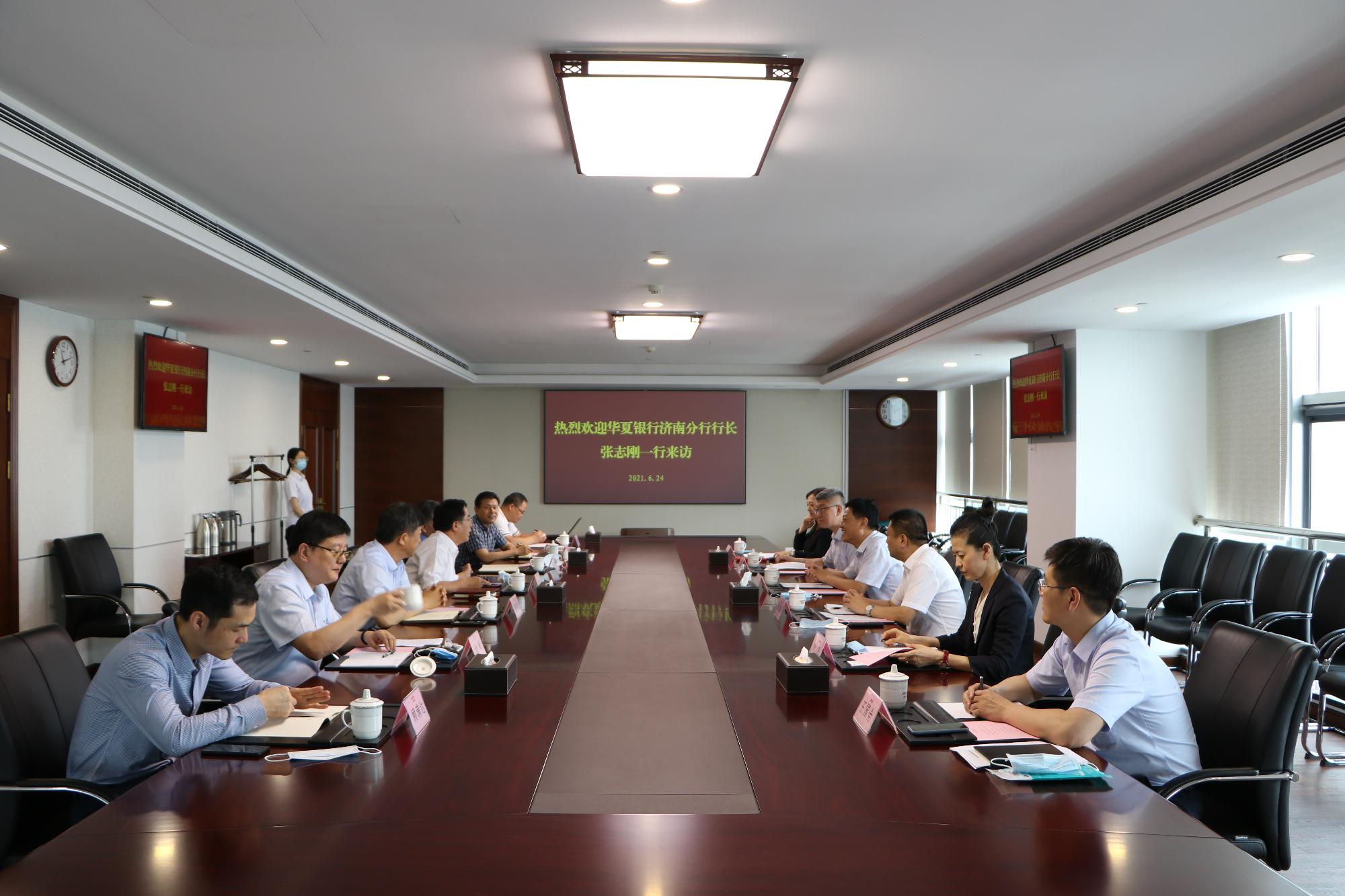 6月24日,鲁商集团党委副书记、总经理郭训成,在济南会见来访的华夏银行济南分行行长张志刚一行。集团党委委员、副总经理张志强出席活动。