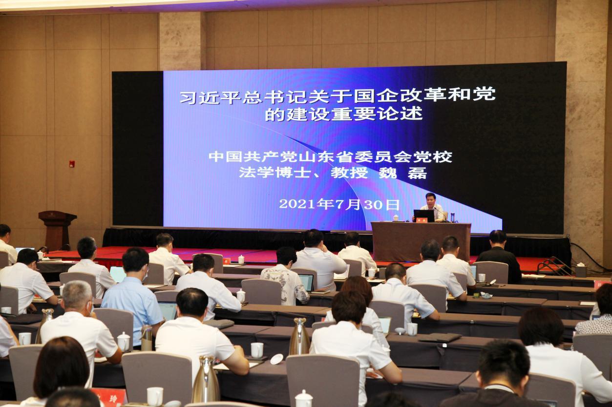 7月30日下午,第十四期“鲁商文化讲堂”暨集团党委理论学习中心组(扩大)2021年第13次集体学习会召开。集团党委副书记、总经理郭训成,党委副书记、董事刘守亮,党委常委、董事、组织人力资源部部长李林,党委常委、纪委书记、省监委驻集团监察专员刘天海,党委常委、总审计师、工会主席刘德华出席。会上,全国党校系统知名专家、省委党校法学博士、教授魏磊作了《深入学习贯彻习近平总书记关于国企改革发展和党的建设的重要论述》主题讲座。
