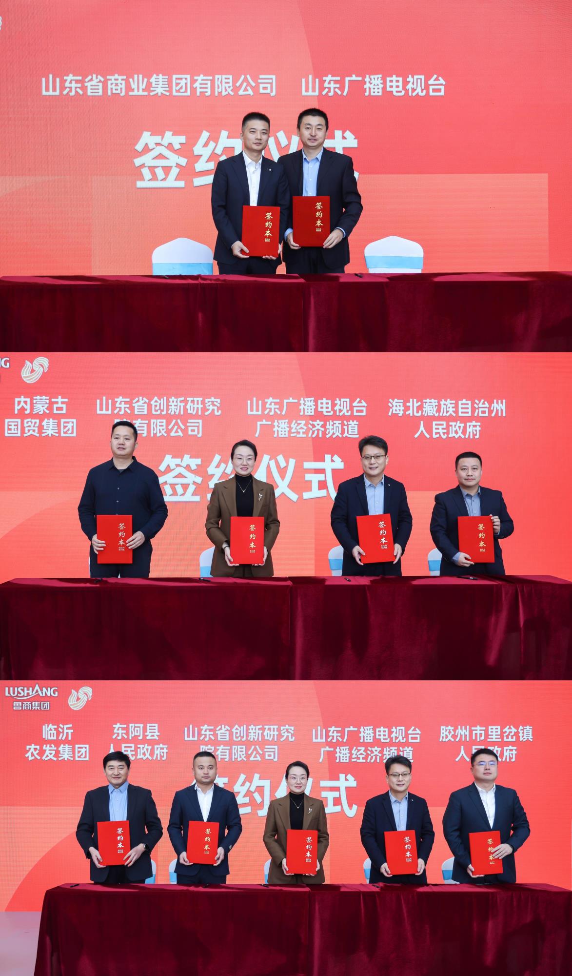 会上,内蒙古国贸集团、青海海北藏族自治州人民政府、聊城东阿县人民政府、胶州里岔镇人民政府、临沂农发集团政企代表分别于与鲁商集团、山东广播电视台等进行了合作签约,标志着各方将在资源共享、产销对接等方面展开深入合作,共同推动山东好品的焕新与发展。