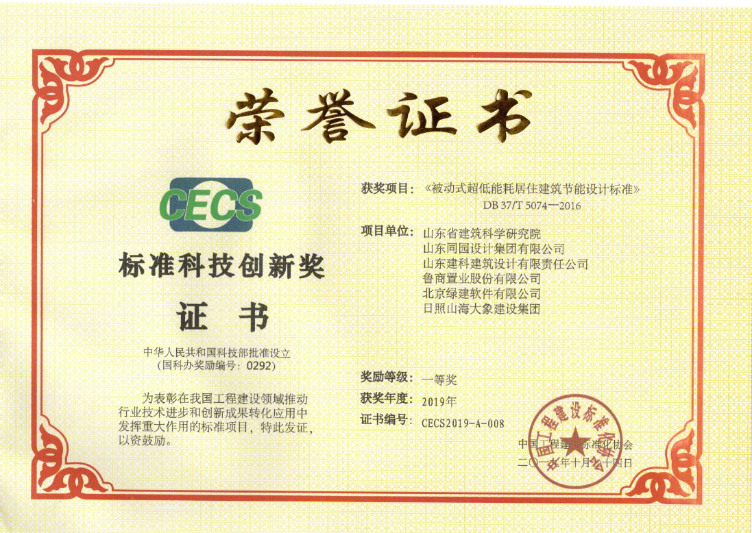 10月24日,中国工程建设标准化协会在杭州举行2019学术年会暨协会成立40 周年纪念活动。会议对第二届标准科技创新奖进行表彰,鲁商健康产业发展股份有限公司(以下简称鲁商发展)参编的《被动式超低能耗居住建筑节能设计标准》项目荣获“标准科技创新奖”一等奖。