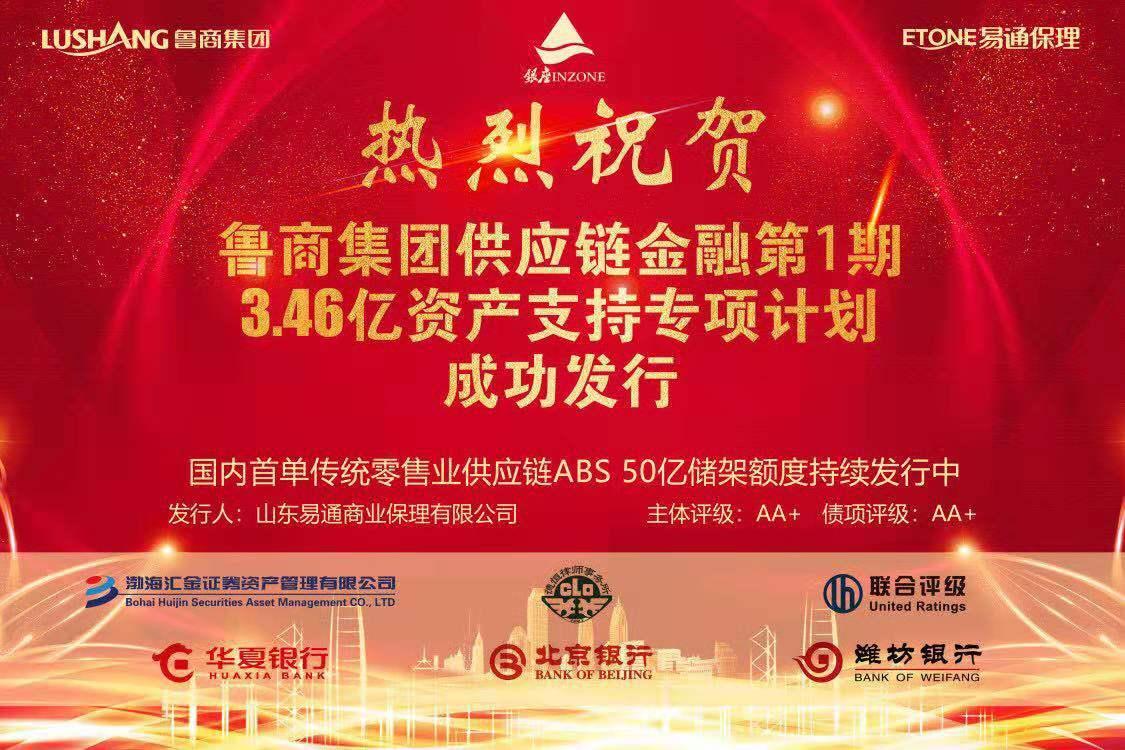 6月6日,省商业集团有限公司(以下简称鲁商集团)供应链金融资产支持专项计划第一期在上海交易所成功发行。本期发行规模3.46亿元,债项评级AA+,产品期限一年。
