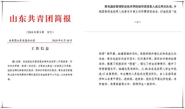 6月10日,“青岛酒店管理职院指导退役军人成立国旗护卫队和志愿消防队”的消息,作为服务青年退役军人典型案例得到《山东共青团简报》2019年第9期报道。