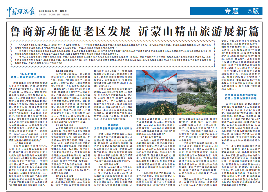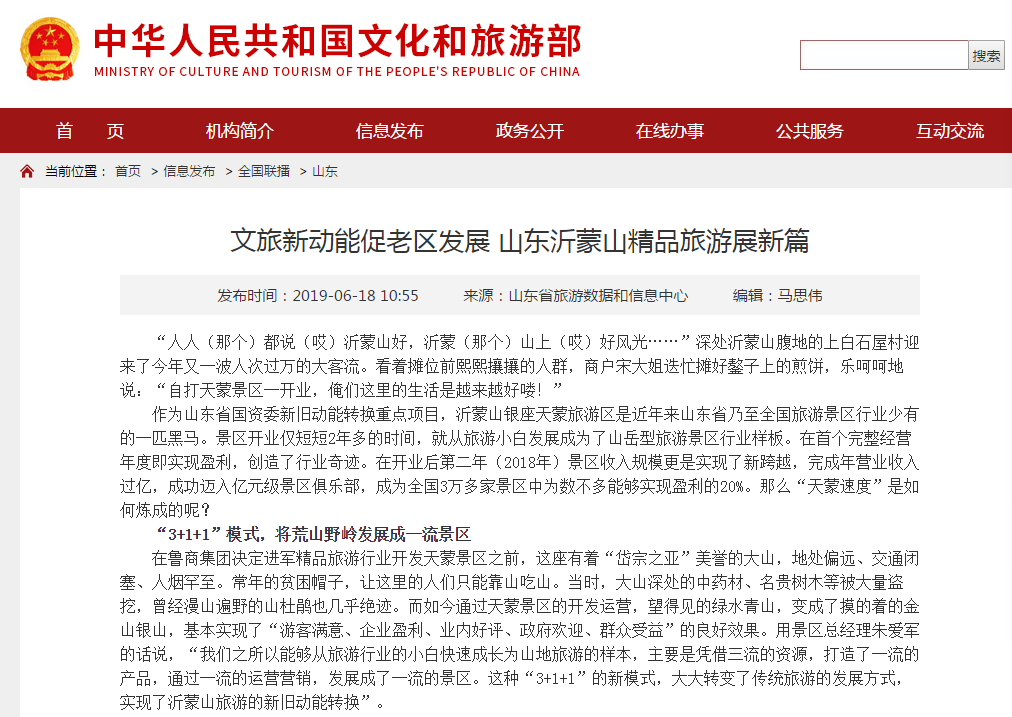 近日,文化和旅游部网站转载中国旅游报文章《鲁商新动能促老区发展 沂蒙山精品旅游展新篇》,对山东省国资委新旧动能转换重点项目——鲁商集团所属沂蒙山银座天蒙旅游区发展模式进行关注。以下为报道全文: