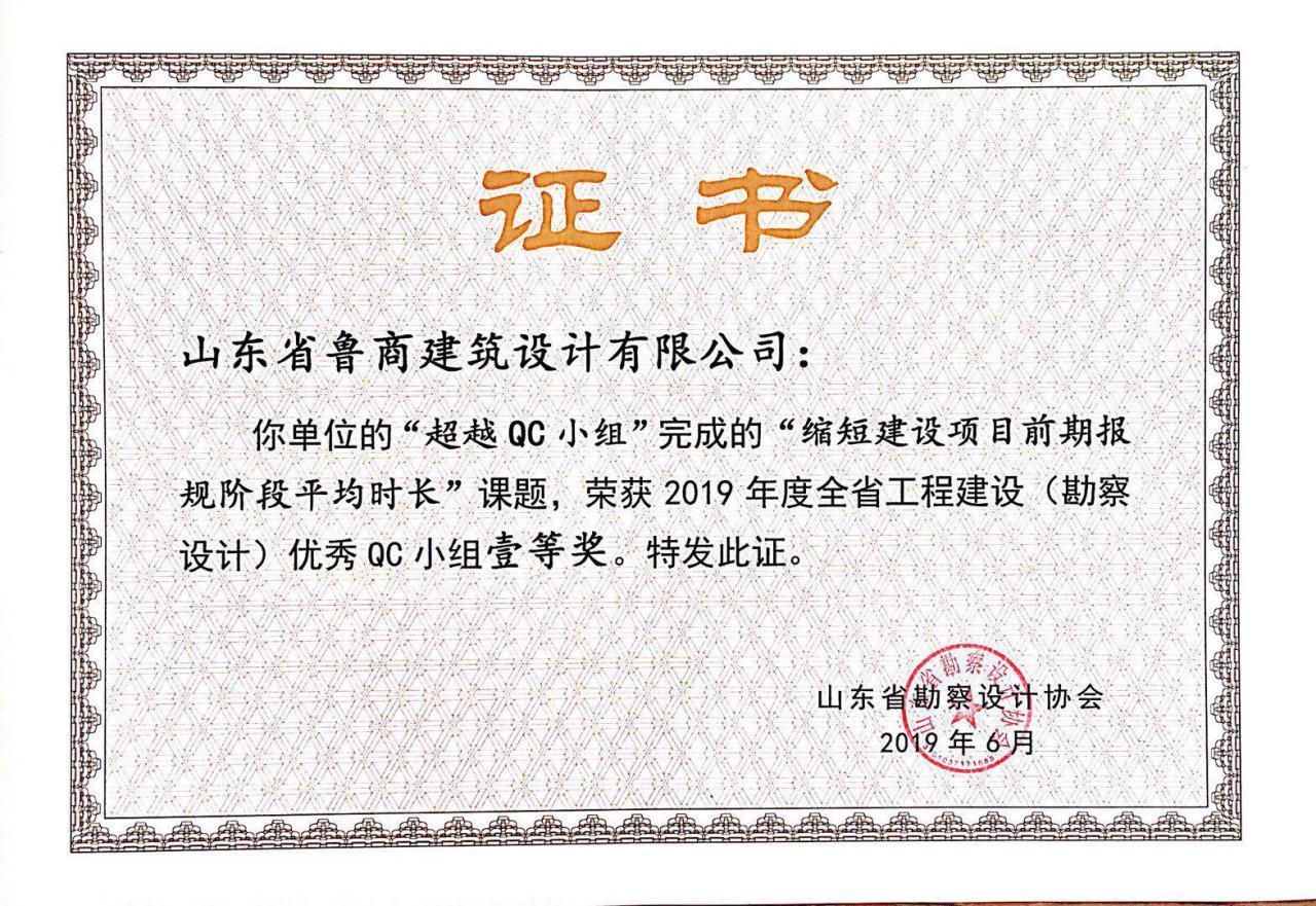 近日,由山东省勘察设计协会组织的2019年度山东省工程建设(勘察设计)优秀QC小组(质量管理小组)评选结果揭晓。经过专家评审,山东省鲁商设计有限公司超越QC小组申报的《缩短建设项目前期报规阶段平均时长》QC成果在324个申报成果中脱颖而出,获得2019年度山东省工程建设(勘察设计)优秀QC小组一等奖。