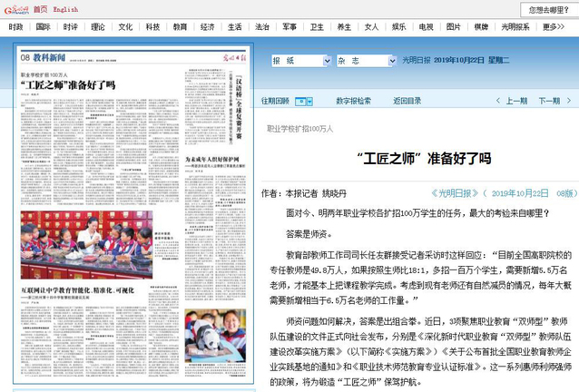 媒体报道称,学院扎实落实教师联系企业制度15年,全院专任教师累计完成4轮赴企业挂职锻炼,“双师型”教师占90%以上,高水平双师队伍建设取得积极成效。近年来,学院贯彻落实全国教育大会精神和《国家职业教育改革实施方案》,通过拓展双师素质培养平台、服务企业发展和大型赛会、建立“校中厂”师资培训基地、积极承担社会服务工作等,逐步打造了一支“专业在前沿、行业有影响、国际可交流”的双师队伍,为学院发展提供了有力支撑,也为职业教育高水平双师队伍建设提供了经验做法。
