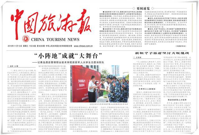 11月13日,《中国旅游报》在第四版以《“小阵地”成就“大舞台”——记青岛酒店管理职业技术学院退役军人大学生志愿消防队》为题,大篇幅报道了学院积极响应《关于做好全省退役士兵安置和权益保障工作的意见》等文件精神,多元施策,着力耕耘“小阵地”,搭建“大舞台”,努力为退役军人大学生们提供优质载体,切实取得良好实效的情况。全文如下: