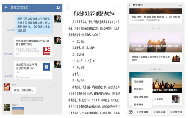 牧工商全体员工通过官方媒体、学习强国及集团发布的疫情相关信息等自行学习,积极关注“樊登读书”微信公众号“防疫直播”栏目,了解疫情动态和疫情防护知识等信息,并采取微信线上“新型冠状病毒防治知识问答”答题、分享等方式,加强疫情防控知识学习。活动中,全体员工积极参与,学习答题热情高涨,在提高自身疫情防护意识的同时,以实际行动正面宣传,引导周围群众,体现国企担当。在确保做好疫情防控工作的基础上,提倡大家充分利用假期时间,多读书多学习,提高知识水平,提升工作能力。