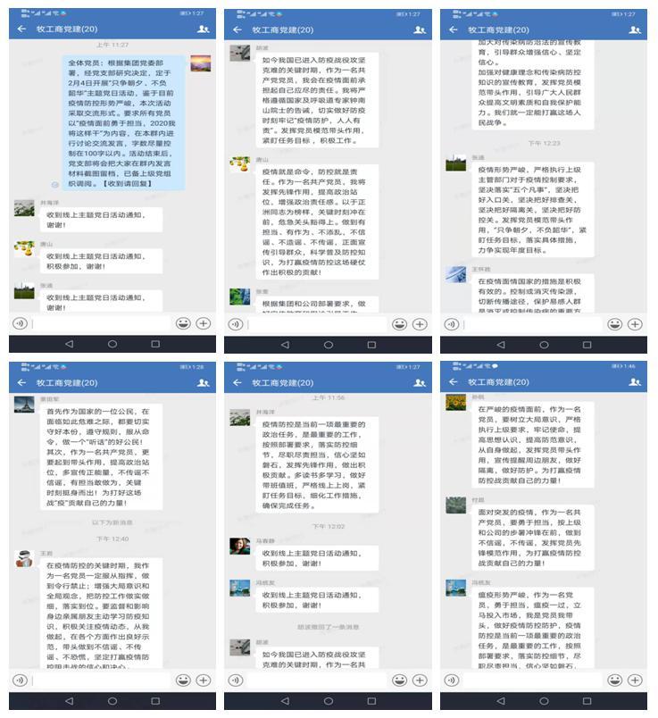 鉴于目前疫情防控形势严峻,本次主题党日活动采取线上交流形式,所有党员以“疫情面前勇于担当,2020我将这样干”为内容,在企业微信群内进行了讨论交流发言,切实做到了防控疫情我带头、政治学习不掉队、党员先锋在行动。