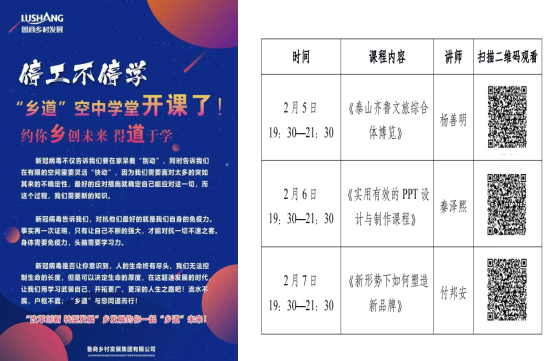 新品牌。“乡创未来 得道于学”。“乡”寓意“乡村”,契合“鲁商乡村发展”中的“乡”;“道”寓意鲁商乡村发展集团正在乡村振兴事业的道路上开疆拓土、探索创新,同时又有领会得道终极真理的“得道”之意。空中学堂创新性建立鲁商乡村发展集团培训体系品牌,逐步搭建乡村振兴“培训专家资源库”和“培训课程资源库”,以优质的课程内容吸引用户、创造价值。