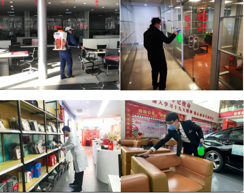 公司物业每天7:30、11:00、16:00分三次对公共区域、营业场所、办公区域、餐厅、洽谈区、客休室等进行全面消毒,科学防护,不留死角;办公室、会议室等场所每天至少三次通风;在展厅入口、前台、客休室等明显位置,我们特意放置了消毒液和免洗洗手液,提醒您勤洗手。