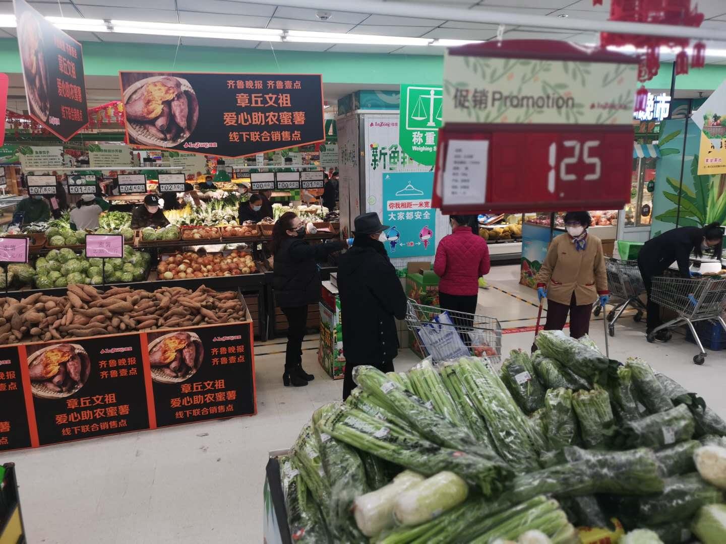 蔬菜区重视顾客购物间距。通过重点单品分析,将重点跑量单品增设分布区,增加包装菜,同时通过加设音响提示、全员提示顾客保持间距等办法,实现顾客自动分离购买。
