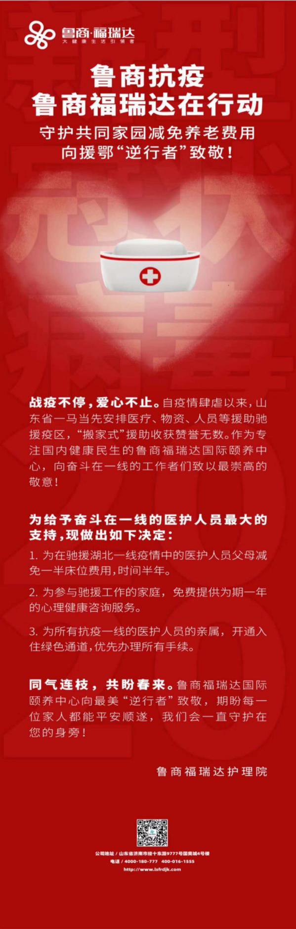 近日,为向驰援湖北一线的医护人员表达敬意,鲁商发展所属的鲁商福瑞达国际颐养中心决定为驰援湖北一线的医护人员父母减免一半床位费用,时间半年。