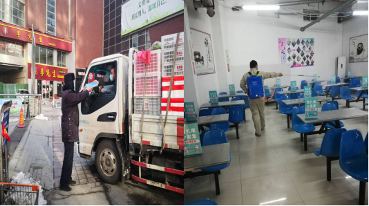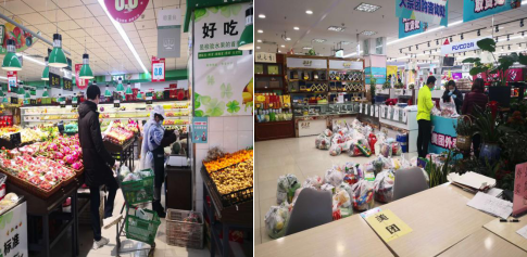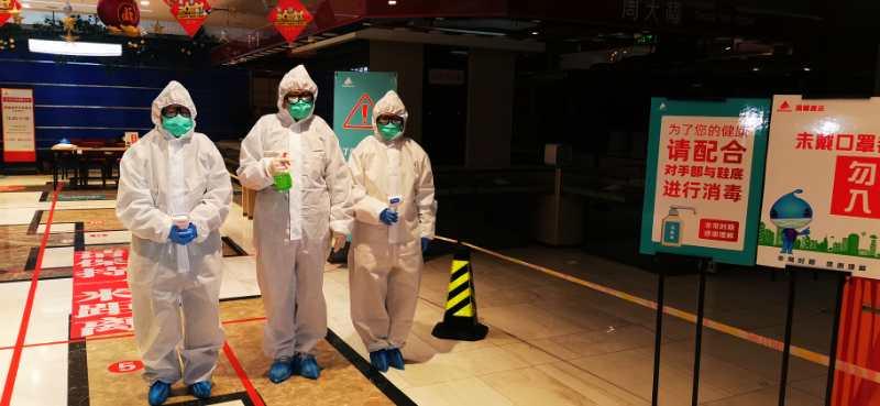 早上8:00,物业部同事开始了营业前消杀工作,对卖场、办公区的购物车、生鲜柜台、收银台、地面、门把手、加工间、卫生间、餐厅、垃圾桶、更衣室等进行全面消毒灭菌处理。蔬菜配货车到达,为配货司机测温、登记、消毒,在停车场外完成第一道检测。