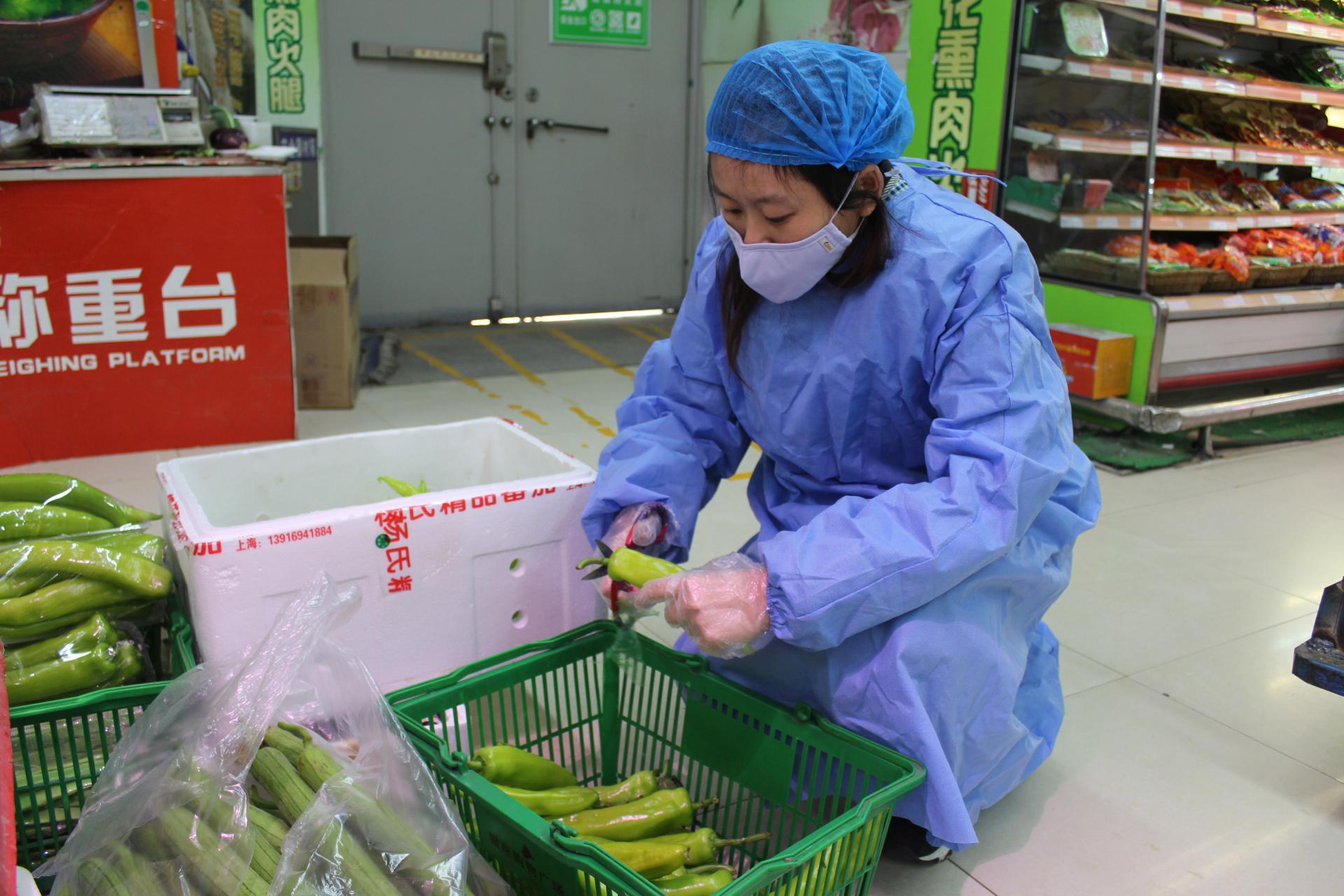 赵丛丛提前穿戴好防护服、手套等,武装好自己。一天的工作就紧张而有序地开始了:开场前,她要带领团队的同事,一起做好货区消毒,蔬菜区50多个单品、堆架头20多个单品的上架,线上平台预订单接收和备货、集中配货,处理线上顾客反映的问题等各项工作。