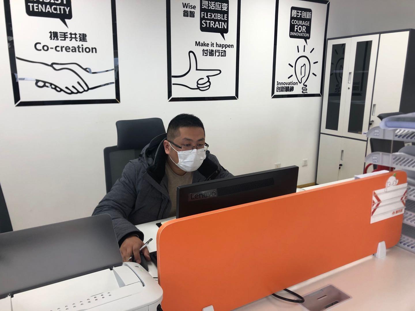 晚上8点多了,综合管理部孙健依然还在办公室“敲电脑”。作为两个娃的爸爸,他放弃假期团聚,在这一特殊时期提前到岗备“战”。自疫情发生以来,80后的孙健将鲁商通疫情防控保障工作做得有声有色。在小伙伴们集体复工前一周,他东奔西跑买来了消毒液和消毒酒精。随后又千方百计多方联系,找到口罩厂家资源,储备了一批医疗防护口罩。