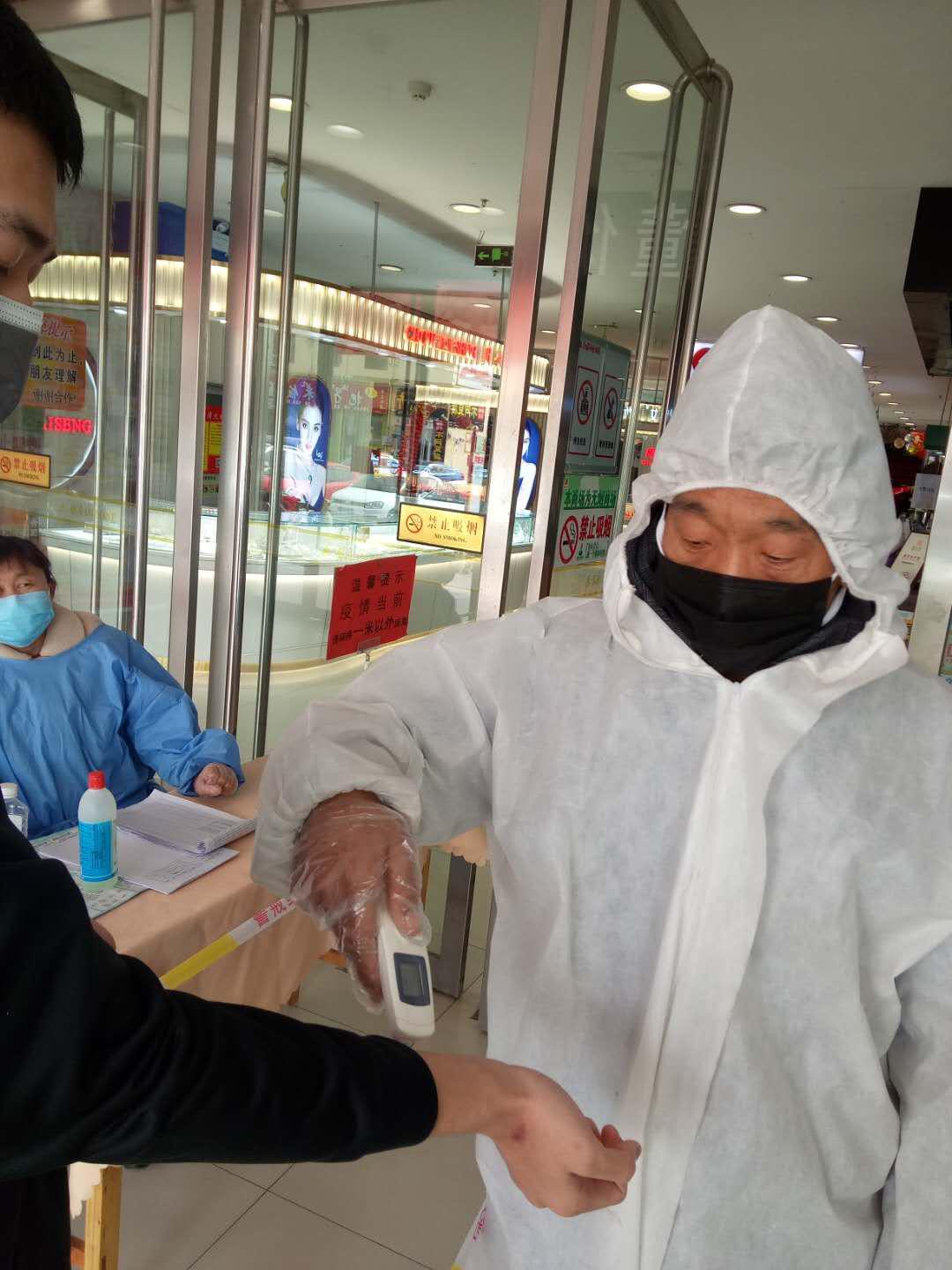 本来陪伴父亲的徐建强,在知道门店严防严控的情况后,不顾领导反对,主动申请返回工作岗位。他说,这个时候,物业消杀及安全管理肯定缺人手,作为物业人员,岗位需要我。他第一时间走上防控一线,为每一位进出超市的员工及顾客测温、消毒、登记,做好疫情监测,并根据相关要求,在开场前及封场后对店内做两次消杀工作。
