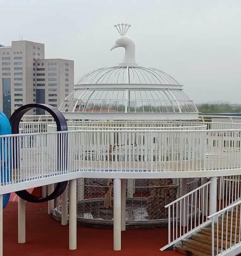 莱芜旗舰店将室外2000余平米的露台改建成一处集休闲、娱乐、社交为一体的空中花园。空中花园设有时光走廊、Mini动物园、绿植景观、游玩区、休息区等,通过塑胶跑道穿插成一个充满童趣、放松心情的乐园。乳白色的大型鸟笼,饲养着孔雀、山鸡等珍禽;长13米、高6米的长颈鹿和卡通笨笨兔色彩艳丽、造型逼真,未来将成为网红打卡圣地;海龟喷泉池,也将成为大小朋友游玩嬉戏、消夏避暑的火爆场所;“吉祥鸟”栩栩如生,屹立于屋檐栏杆处,跳跃俯冲一飞升天,现已成为莱芜城区一道亮丽风景线。
