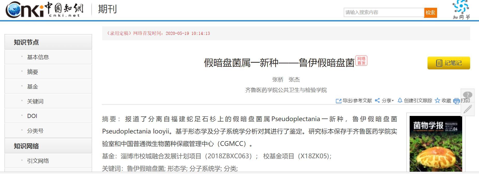 日前,中国科学院微生物研究所《菌物学报》传来消息,齐鲁医药学院微生物研究团队发现的假暗盘菌新物种获得认可,并以齐鲁医药学院命名“鲁伊假暗盘菌”(Pseudoplectania looyii Q. Zhang & J. Zhang)。假暗盘菌属建立已有150年,该新种为世界第12个、中国第3个。