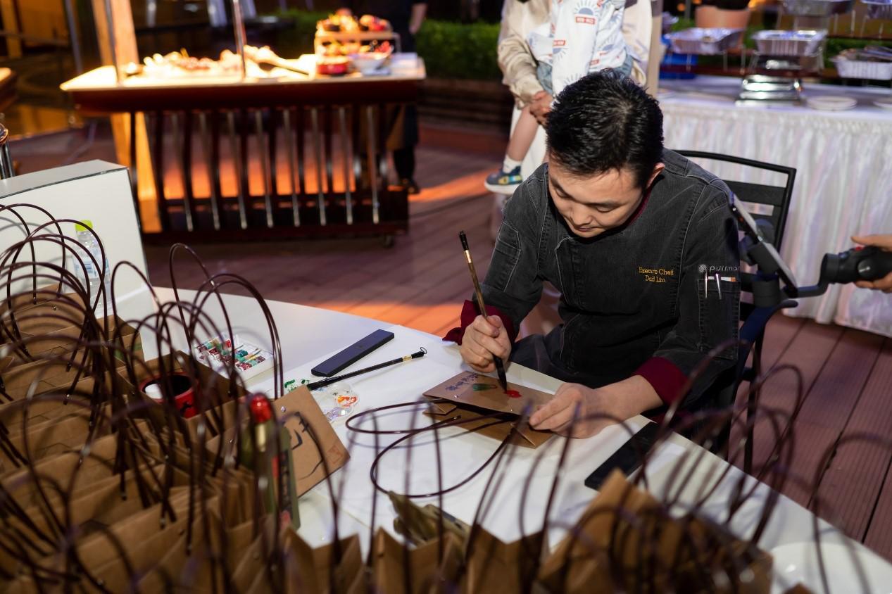 “大家好,此次作品为三份手写菜单,5.21元起拍,竞拍开始!”临沂鲁商铂尔曼行政总厨刘国安将书法与菜单相结合,富有艺术气息。现场以及手机端的粉丝兴趣浓厚,纷纷举牌,最终三款产品以556元成交。随后,刘厨变身画师,在手提袋上画满了寓意美好的白菜、樱桃等,客人购买后可将手提袋装满粽子并带走,现场收入近2000元。