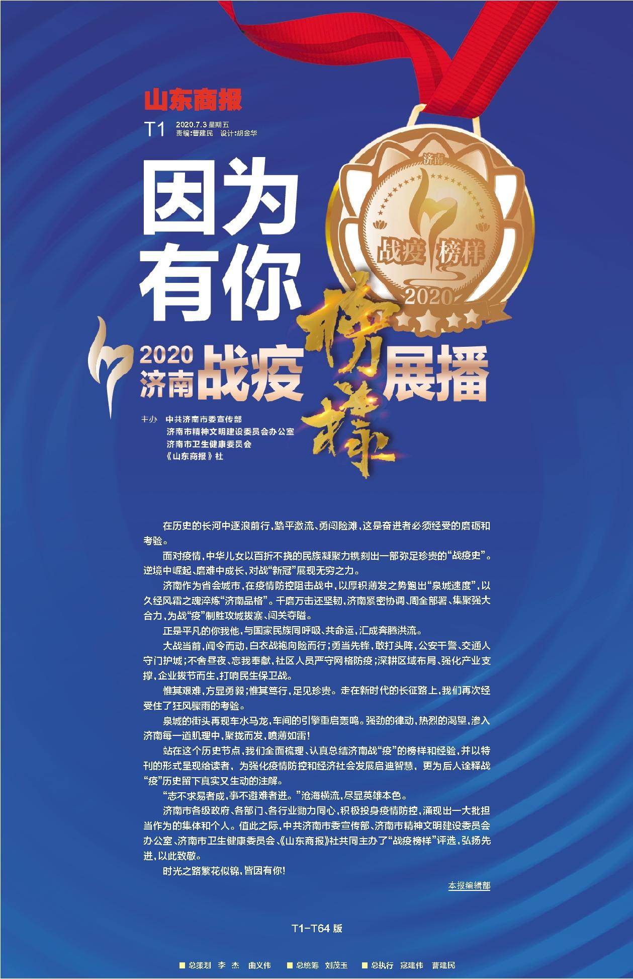 没有从天而降的英雄,只有挺身而出的凡人。自新冠肺炎疫情发生以来,全国上下积极应对,打响了一场没有硝烟的阻击战。为宣传弘扬先进典型,致敬“战疫”英雄,从4月起,由鲁商传媒《山东商报》社策划执行,济南市委宣传部、济南市文明办、济南市卫健委、《山东商报》社联合推出战疫榜样评选活动。