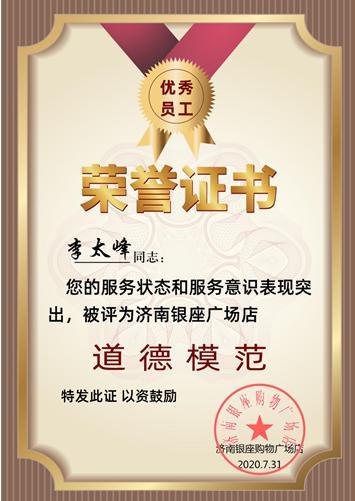 2018年,李太峰荣获银座广场店“我身边的榜样”荣誉称号,门店同时发起了向李太峰同志学习的倡议。这时又有人问李太峰,当了模范又当榜样,什么感觉?他仍然是淡淡一笑:“俺还是好好干好自己的活吧。”朴朴素素的语言,不会豪言壮语,不会侃侃而谈,有的只是脚踏实地,有的只是全心投入。
